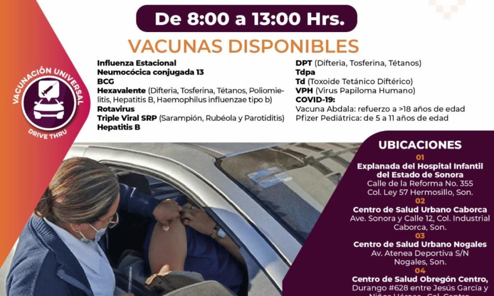 La Secretaría de Salud acercará servicios de vacunación general, en modalidad de servicio al auto o “drive thru”, en Hermosillo, Caborca, Navojoa, Ciudad Obregón, San Luis...