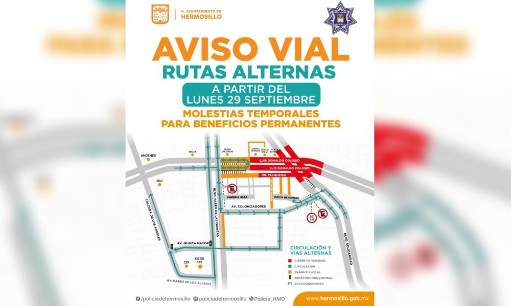 Debido a los trabajos de construcción del paso a desnivel del bulevar Colosio y Solidaridad, a partir del lunes 29 de septiembre se cerrará la avenida...