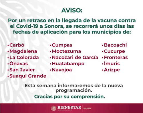 La delegación de la Secretaría de bienestar en Sonora, informó que se retrasó la llegada de la vacuna contra Covid 19, por ello se pospuso la aplicación del biológico en los siguientes municipios: