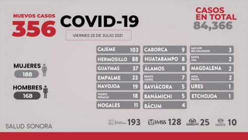 La ola de contagios continúa en Sonora, la Secretaría de Salud confirmó 356 nuevos casos por COVID, para un total de 84 mil 366 casos en la entidad.