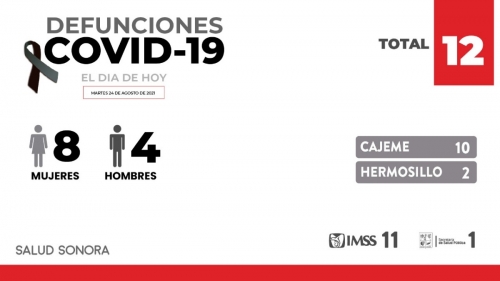 En cuanto a los datos estadísticos de este martes, 86 mil 800 personas se han recuperado en Sonora; 16 pacientes Covid fueron dados de alta; se confirmaron 12 decesos en ocho mujeres y cuatro hombres residentes de Cajeme 10; Hermosillo dos; derechohabientes del IMSS 11, y de la Secretaría de Salud uno; acumulándose 7 mil 105 defunciones.