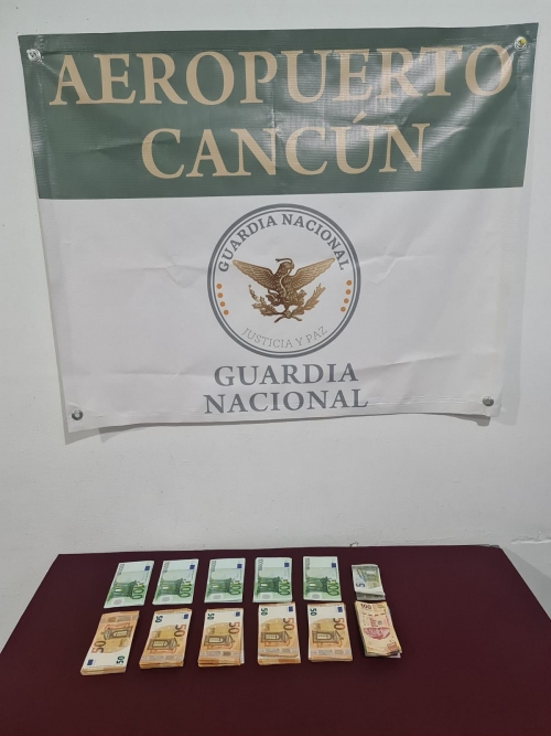 Cancún, Quintana Roo. 24 septiembre 2021. Una mujer fue sorprendida por elementos de la Guardia Nacional (GN), cuando intentó abordar un avión en el Aeropuerto de Cancún, Quintana Roo, con más de 9 mil 210 euros en efectivo y sin declararlos ante la autoridad hacendaria.