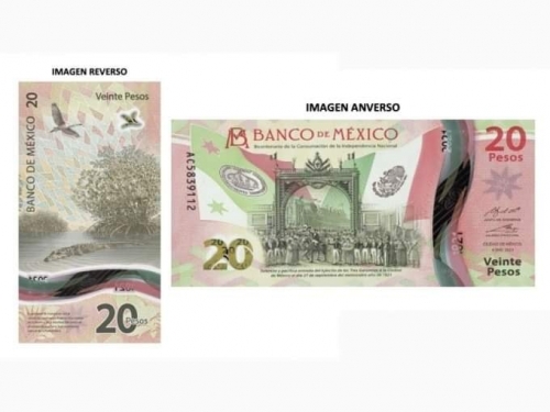 El Banco de México dio a conocer que se trata del primero con orientación mixta, horizontal al frente y vertical al reverso, con alusiones claras a la consumación de la independencia de México, a los manglares de México, y al cocodrilo mexicano.
