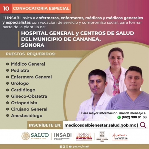 Hermosillo, Sonora, octubre 21 de 2021.- La Secretaría de Salud de Sonora, a través del Instituto de Salud para el Bienestar, busca personal médico y de enfermería para el Hospital General de Cananea y centros de Salud de dicho municipio.