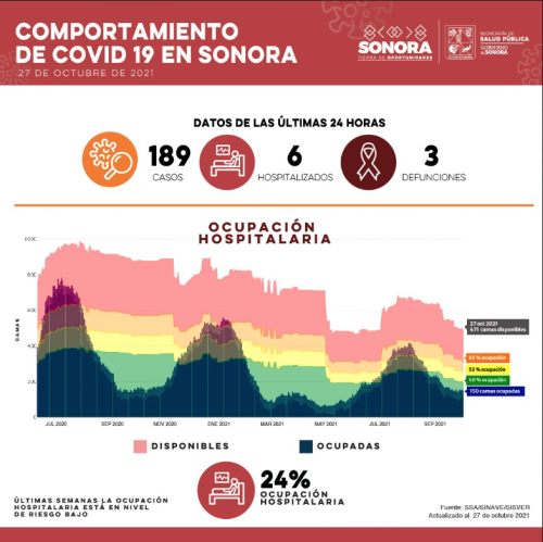 Hermosillo, Sonora, 27 de octubre de 2021.- La secretaría de Salud en el estado informó que este día se registraron 189 nuevos casos y tres defunciones por Covid-19.