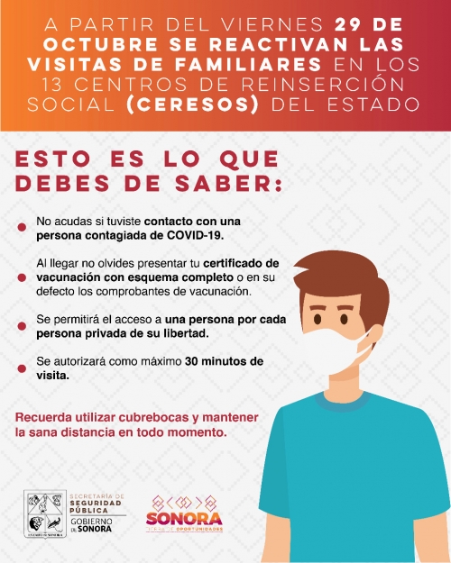 Hermosillo, Sonora; 28 de octubre de 2021.- A partir de este viernes 29 de octubre se reanuda la vista familiar en los 13 Centros de Reinserción Social (Ceresos) en Sonora, siguiendo estrictas medidas sanitarias para evitar el contagio de Covid-19, acordaron autoridades del Sistema Estatal Penitenciario, Secretaría de Salud y organismos de derechos humanos.