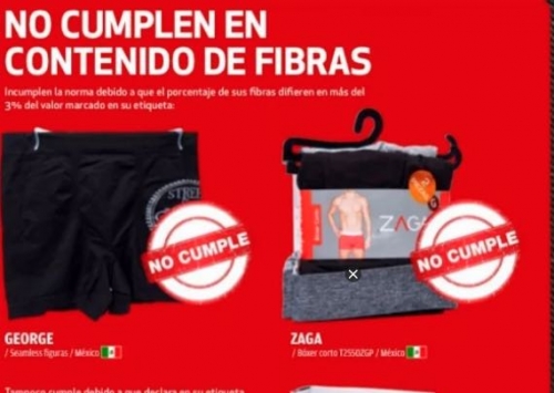 Hay tres modelos que no cumplen con el contenido de fibra que dicen tener en la etiqueta, así que al tener más de 3% de diferencia de contenido incumplen la norma aplicable por lo que se inmovilizarán, es decir, se prohibirá su venta hasta que se apeguen a la normatividad. Por ejemplo, Zaga boxer corto T2550ZGP “difiere en más del 3 por ciento del valor marcado en su etiqueta”. A pesar de ello, Profeco lo calificó como un producto Muy Bueno.