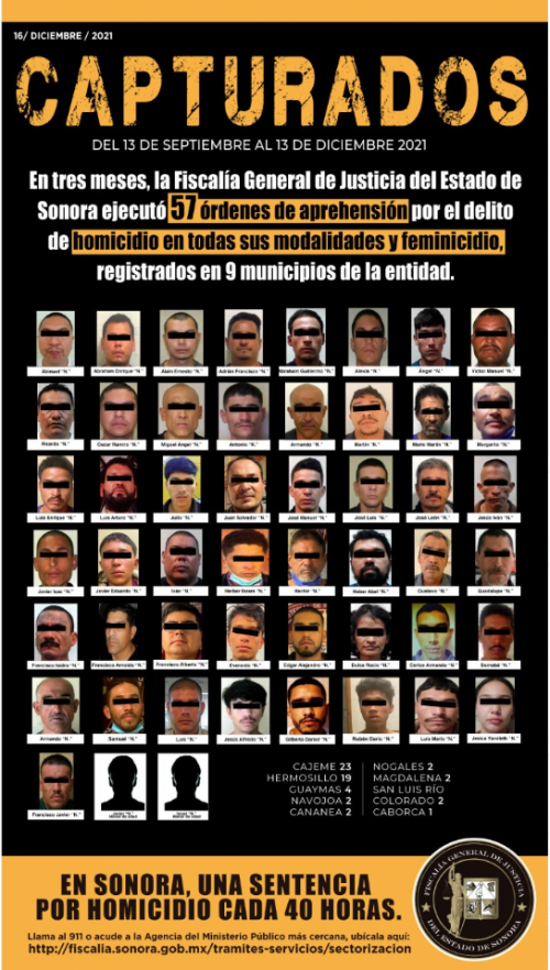 De las 57 personas aseguradas, y presentantes ante diversos Jueces, corresponden 23 a Cajeme, 19 a Hermosillo, 4 a Guaymas, 2 a Navojoa, 2 a Cananea, 2 a Nogales, 2 a Magdalena, 2 a San Luis Río Colorado y 1 a Caborca.