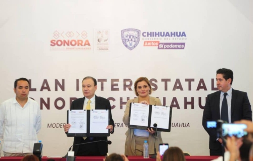 Hermosillo, Sonora 6 de Junio del 2022 - La Gobernadora del Estado de Chihuahua, Maru Campos Galván asi como El Gobernador Alfonso Durazo realizan firma de convenio con el objetivo de sumar esfuerzos para materializar el proyecto de la modernización de la carretera de Guaymas-Chihuahua la cual constara de 250 Kilometros en Sonora y 185 en Chihuahua que ayudara al sector productivo ya que se permitirá expotar productos vía Guaymas.