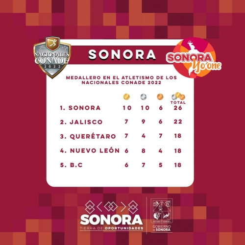 Sonora terminó como líder del medallero de la primera etapa del atletismo en los Nacionales Conade 2022, al conquistar 10 medallas de oro, 10 de plata y 6 de bronce, tras celebrarse las categorías Sub 16 y Sub 23 en ambas ramas.