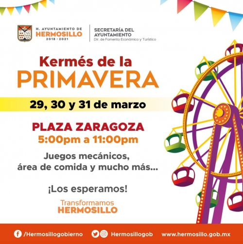 Hermosillo, Sonora, 27 de marzo de 2019.- Una ocasión de sana convivencia tendrán los hermosillenses este fin de semana durante la Kermés de la Primavera, en la que niños y adultos podrán disfrutar de juegos mecánicos y variados antojitos en un ambiente seguro y familiar, informó Alberto Hernández Taddei.