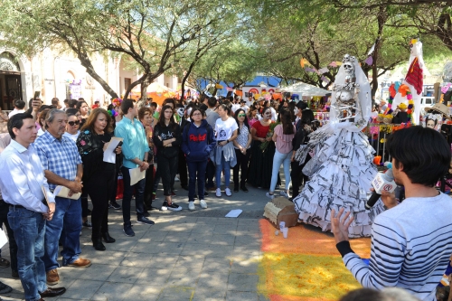 La Plaza Hidalgo se vistió del color, al ser el escenario ideal de 22 altares, muestra de la creatividad de los estudiantes sonorenses, quienes homenajearon la memoria de personajes como: María Félix, Rodolfo Campodónico, Pedro Infante, La Adelita, Sor Juan Inés de la Cruz, estudiantes de Tlatelolco, entre varios más.