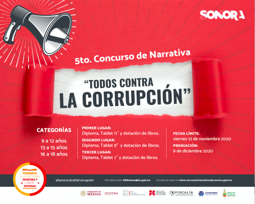 Hermosillo, Son.; 16 de agosto de 2020. Niñas, niños y jóvenes entre 9 y 18 años podrán participar en el 5to. Concurso de Narrativa “Todos contra la Corrupción”, gracias a la alianza entre el Instituto Sonorense de Cultura, la Fiscalía Anticorrupción y la Secretaría de Cultura, con apoyo de Coparmex.