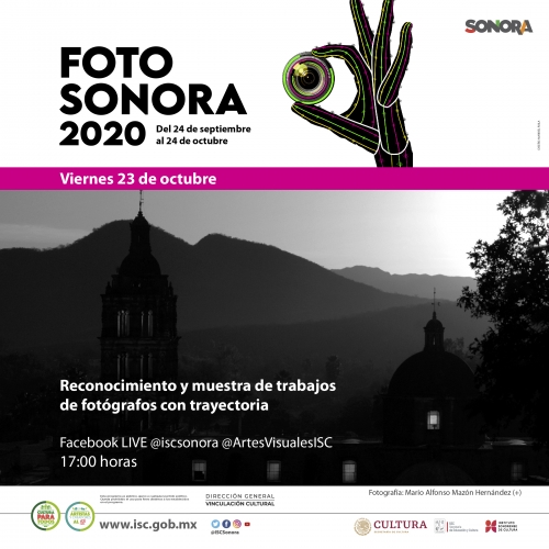 FotoSonora se realiza en redes sociales desde el pasado 24 de septiembre y concluirá este sábado 24 de octubre con dos actividades: A las 10:00 horas (tiempo de Sonora), se realizarán Mesas de trabajo sobre la fotografía en Sonora, a través de plataforma Zoom y a las 12:00 horas, un Facebook live desde la cuenta @ArtesVisualesISC con un conversatorio sobre el mismo tema. Para mayor información puede comunicarse a través del correo fotosonora@isc.gob.mx