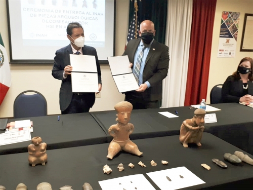 Bajo un estricto de protocolo de sanidad por la pandemia de COVID 19, se llevó a cabo la entrega de bienes culturales, patrimonio de la nación mexicana, en la que estuvieron presentes el cónsul general de México en Nogales, Arizona, embajador Ricardo Santana Velázquez, el agente especial encargado del ICE/Homeland Security Investigations, Scott Brown, la cónsul general de Estados Unidos de América en Nogales, Sonora, Laura Biedebach, y el Antropólogo José Luis Perea González, director del Centro INAH Sonora.