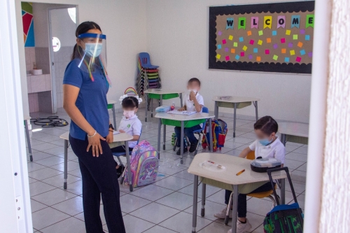 Hermosillo, Sonora; abril 26 de 2021. A partir de este lunes especialistas de la Secretaría de Salud en Sonora acompañan a un máximo de 150 niñas y niños de dos centros educativos privados de la entidad en la primera etapa del modelo Anticipa Educando Sonora, con el que se busca implementar los protocolos contra COVID-19, desde la entrada a las instalaciones escolares hasta la salida y capacitar a padres de familia para cuando se dé el regreso a clases.