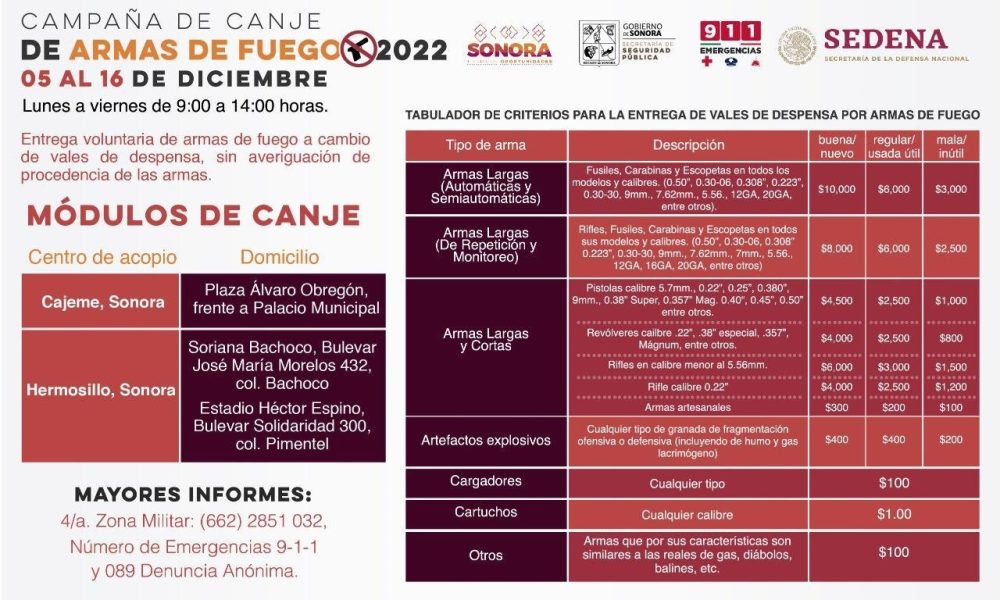 Del 5 al 16 de diciembre se llevará a cabo la Campaña de Canje de Armas de Fuego 2022 en Sonora, donde la ciudadanía puede intercambiar...