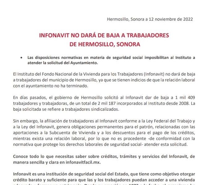 Por disposiciones normativas, Infonavit no puede quitarle la prestación de vivienda a 1400 trabajadores sindicalizados de la comuna como plantea el Presidente municipal. Ver vídeo:
